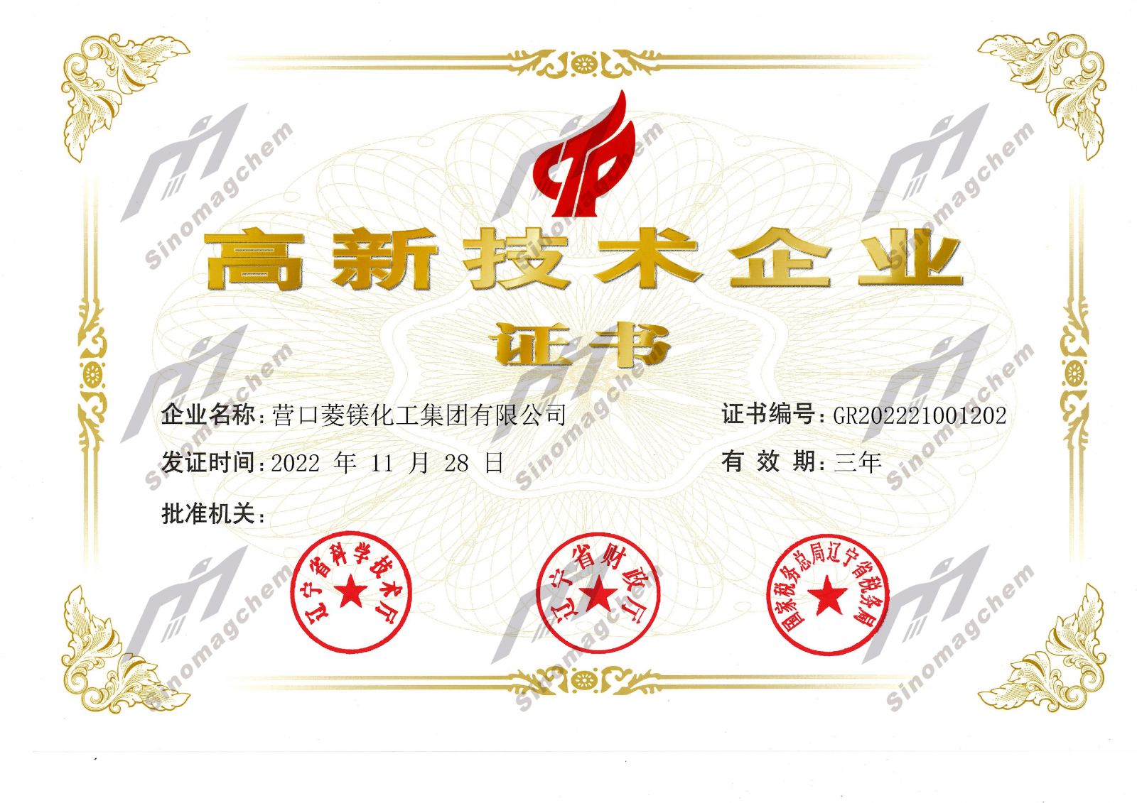 根據國家《高新技術企業認定管理辦法》和《高新技術企業認定管理工作指引》的相關規定,營口菱鎂化工集團有限公司順利通過2022年高新技術企業再認定。根據國家《高新技術企業認定管理辦法》和《高新技術企業認定管理工作指引》的相關規定,營口菱鎂化工集團有限公司順利通過2022年高新技術企業再認定。